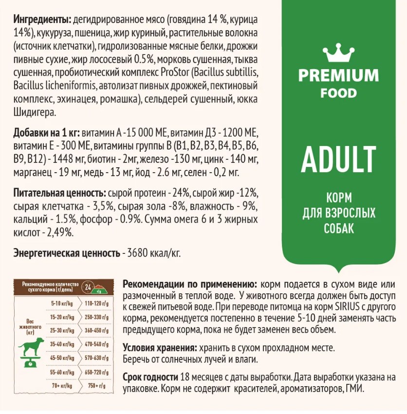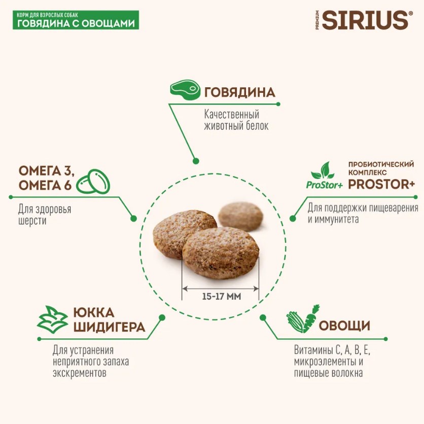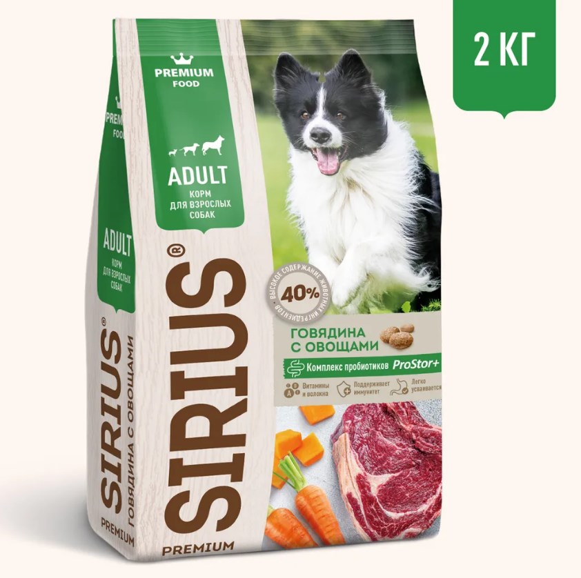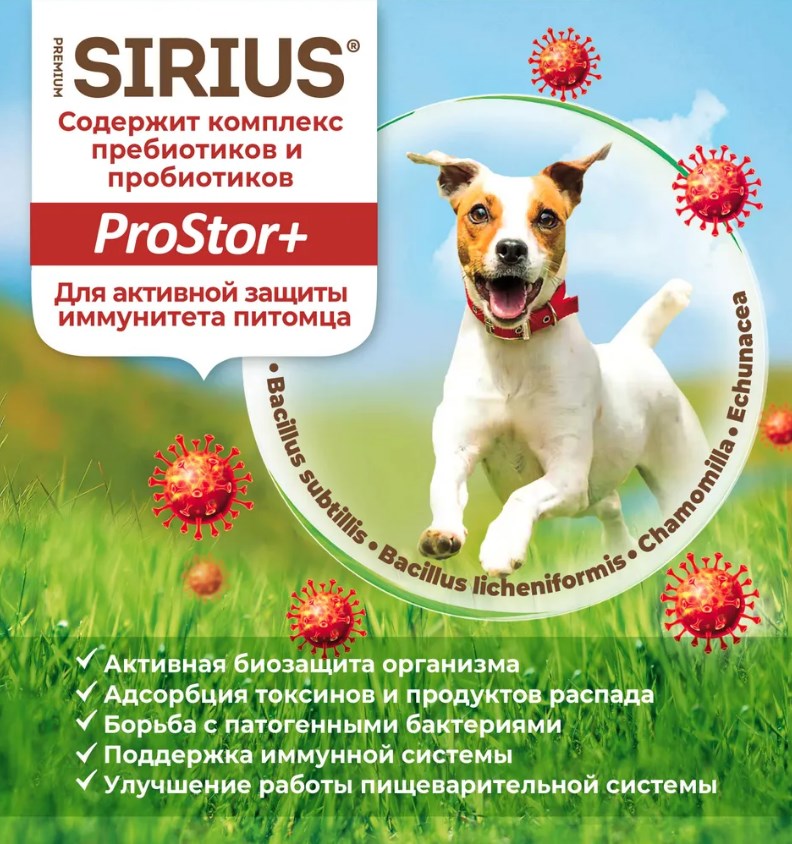 SIRIUS — сухой корм премиум-класса для полноценного ежедневного рациона взрослых собак. Высокое содержание мясных ингредиентов обеспечивает оптимальный уровень белка и укрепляет мышцы. Баланс витаминов и комплекса пробиотиков 4-го поколения PROSTOR+ нормализует пищеварение и укрепляет иммунитет. Омега 3 и Омега 6 способствуют поддержанию здоровья сердца, мозга, нервной системы, здоровья кожи и красоты шерсти.
