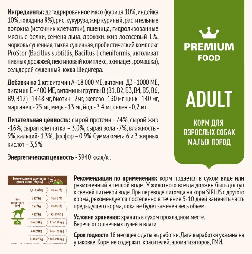 SIRIUS — сухой корм премиум-класса для полноценного ежедневного рациона взрослых собак малых пород. Высокое содержание мясных ингредиентов обеспечивает оптимальный уровень белка и укрепляет мышцы. Баланс витаминов и комплекса пробиотиков 4-го поколения PROSTOR+ нормализует пищеварение и укрепляет иммунитет. Омега 3 и Омега 6 способствуют поддержанию здоровья сердца, мозга, нервной системы, здоровья кожи и красоты шерсти.