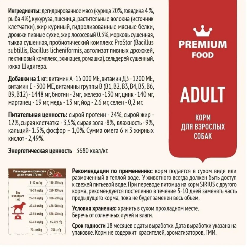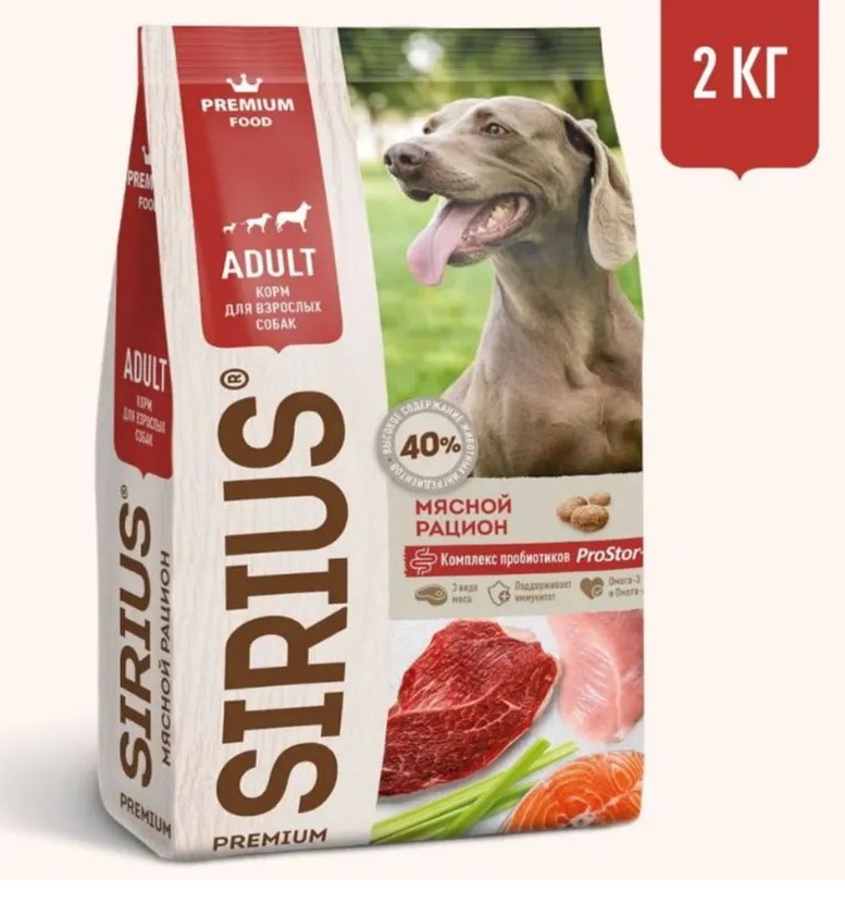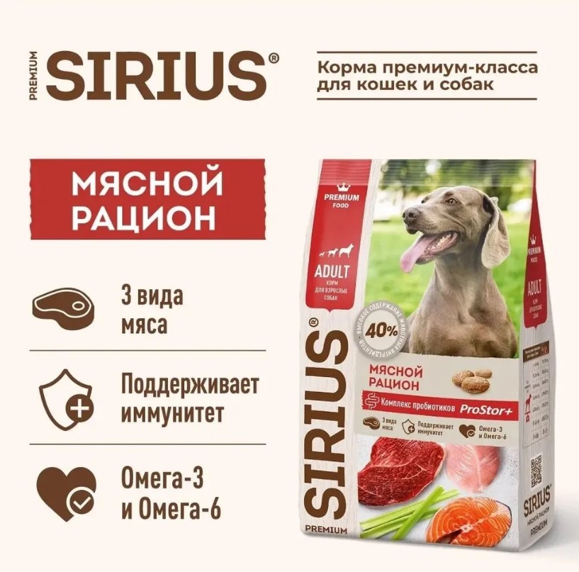 SIRIUS — сухой корм премиум-класса для полноценного ежедневного рациона взрослых собак. Высокое содержание мясных ингредиентов обеспечивает оптимальный уровень белка и укрепляет мышцы. Баланс витаминов и комплекса пробиотиков 4-го поколения PROSTOR+ нормализует пищеварение и укрепляет иммунитет. Омега 3 и Омега 6 способствуют поддержанию здоровья сердца, мозга, нервной системы, здоровья кожи и красоты шерсти.