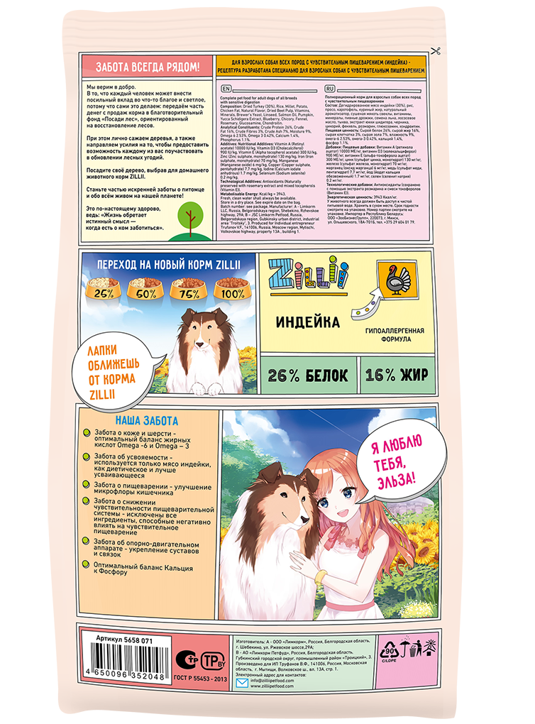Рецептура ZILLII ADULT ALL BREEDS DOGS/SENSITIVE DIGESTION специально создана для собак всех пород с чувствительным пищеварением. Мясо индейки идеально подходит для чувствительного пищеварения из-за высокой усвояемости. Богатое витаминами А и Е, а также натрием, мясо индейки помогает обеспечивать нормальные обменные процессы в организме животного. Формула сбалансирована так, чтобы удовлетворить все потребности организма собаки в питательных веществах, исключая любое негативное влияние на пищеварительные процессы.