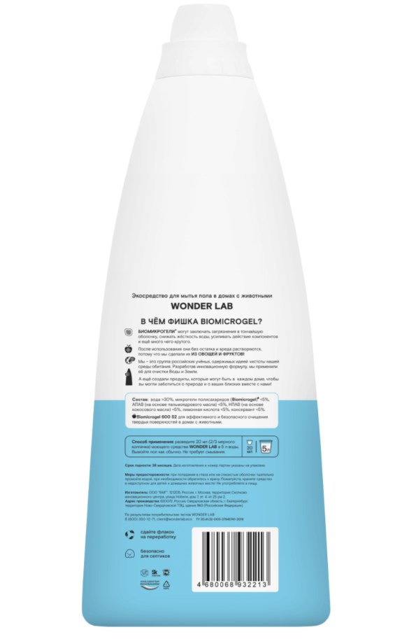 Состав: вода >30%, микрогели полисахаридов (Biomicrogel) <5%, АПАВ (на основе пальмоядрового масла) <5%, НПАВ (на основе кокосового масла) <5%, лимонная кислота <5%, консервант <5 %.
