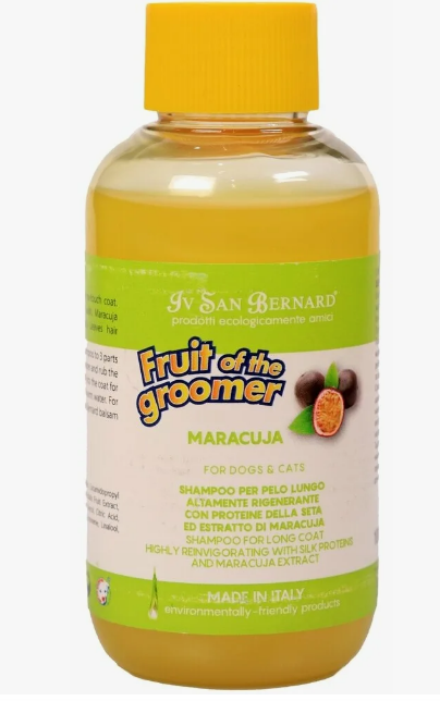 Шампунь Iv San Bernard Fruit of the Groomer Maracuja для длинной шерсти с протеинами Шампунь разработан для частого применения. Придает шерсти шелковистость, обладает оживляющим эффектом. Полезные свойства активных растительных компонентов маракуйи смешаны с защитным и укрепляющим действием протеинов. Душистый аромат маракуйи создает приятное настроение у животного и у Вас. Способ применения: нанести достаточное количество шампуня на хорошо смоченную шерсть массирующими движениями. Оставить на 3 мин., смыть водой. При необходимости повторить. Для удобства применения можно разбавить шампунь водой 1:3. Для наилучшего эффекта после шампуня используйте маску - восстановитель "Маракуйя с протеинами".