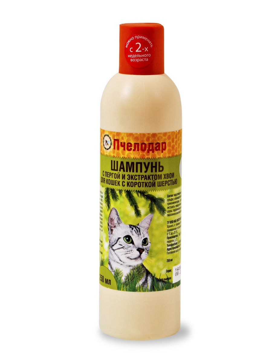 Шампунь с пчелиной пергой и экстрактом хвои для короткошерстных кошек разработан специально для постоянного ухода за шерстью и поддержания здоровья кожи. Входящие в состав шампуня натуральные компоненты (перга, экстракт хвои и сбор трав) оказывают выраженное антисептическое, ранозаживляющее и дезодорирующее действие на кожу животного, глубоко питают, увлажняют и стимулируют рост шерстного покрова; помогают сократить период линьки и предотвратить чрезмерное выпадение шерсти. Шампунь регулирует работу сальных желез и помогает справиться с неприятным запахом животного. При регулярном применении шампуня остевой волос и подшерсток насыщаются питательными веществами (витаминами, микро- и макроэлементами, аминокислотами), восстанавливаются изнут