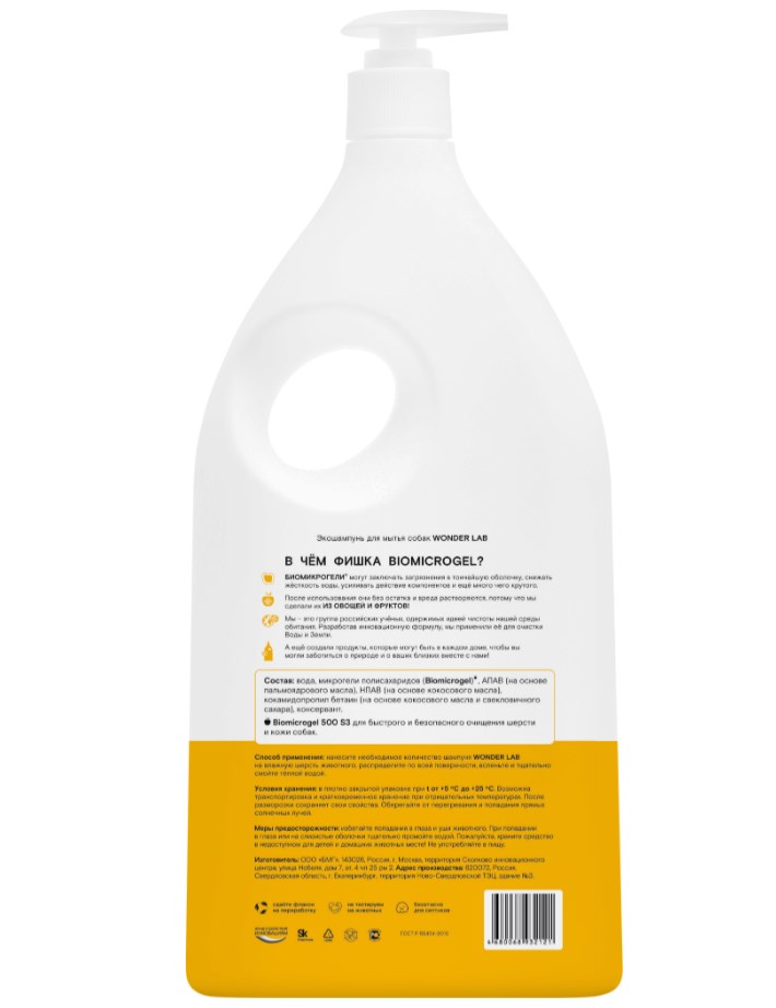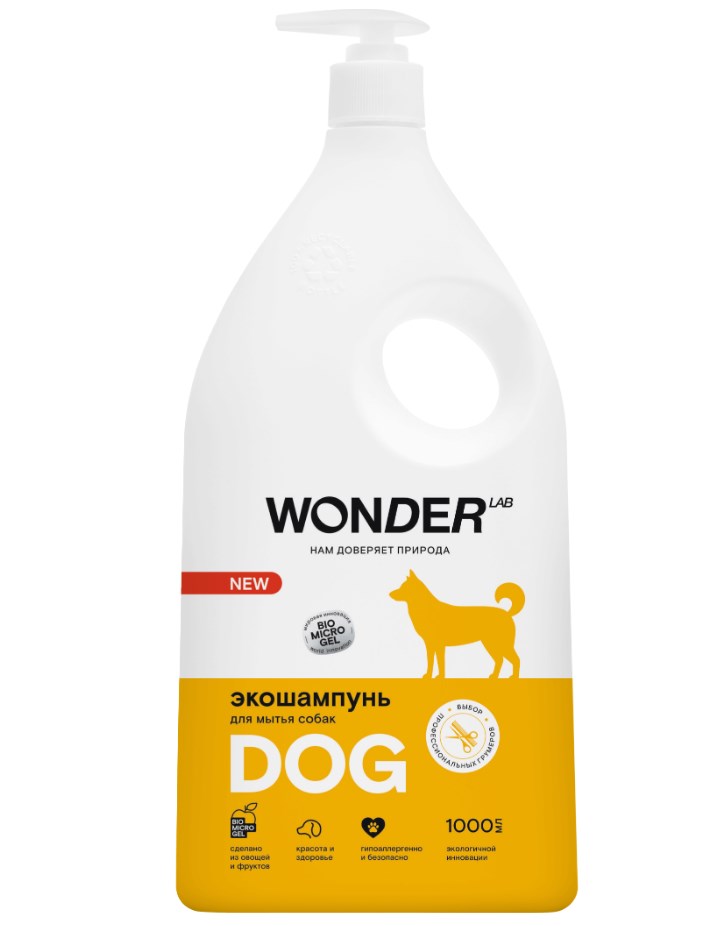 Благодаря отсутствию лишних ароматов, шампунь не будет раздражать вашего любимца и не будет провоцировать аллергию. Экономичный расход и удобный дозатор. В составе экошампуня нет красителей, отдушек и щелочного мыла. После мытья экошампунем, шерсть приобретает здоровый блеск и хорошо расчесывается. Средством можно мыть и лапы животного после прогулки. Шампунь не оставляет посторонних запахов на шерсти собаки, полностью смывается, что безопасно для животного при вылизывании после купания. Экошампунь WONDER LAB одобрен профессиональными грумерами.