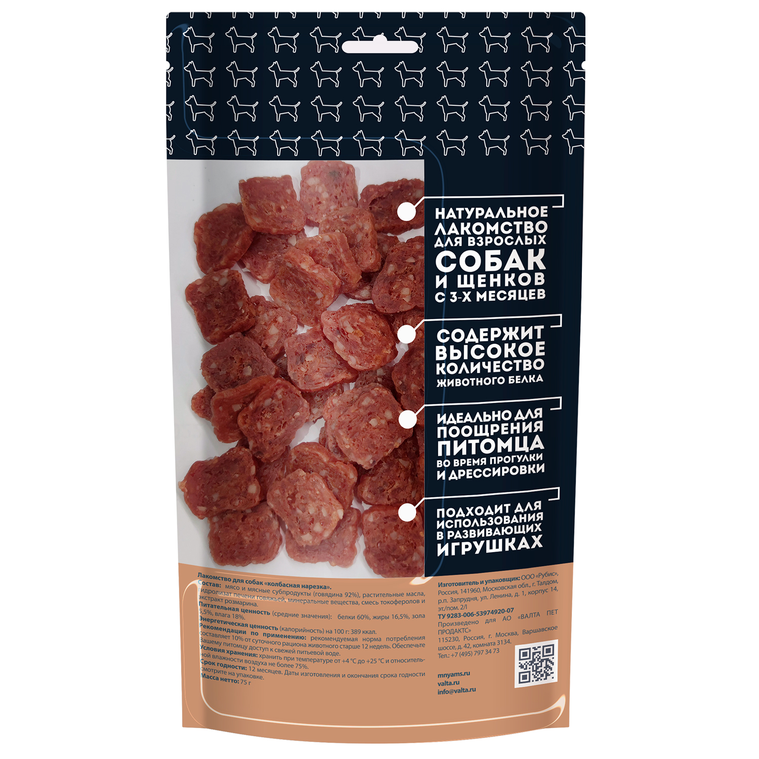 Мнямс лакомство для собак Колбасная нарезка - вкусное и полезное лакомство для собак и щенков старше 3-х месяцев с высоким содержанием белка, незаменимыми аминокислотами, витаминами и минералами. Обладают высокой вкусовой привлекательностью, благотворно влияют на нервную и сосудистую системы. Идеально подходят в качестве ежедневного угощения и поощрения во время тренировок.