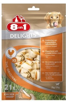 8in1 DELIGHTS XS косточки для мелких собак.Аппетитное куриное мясо, завернутое в жесткую говяжью кожу высшего качества – уникальное сочетание жевательной косточки и средства поощрения.• 9 из 10 собак предпочитают лакомство Делайтс*• Уникальный и запатентованный продукт• Заботится о зубах• Уменьшает зубной налет и тем самым предотвращает образование зубного камня• Удовлетворяет природный жевательный инстинкт собаки• Долго жуется, съедается без остатка• Содержит всего 2 % жира• Не содержит искусственных красителей и усилителей вкуса* Исследование предпочтений 2010г.Упаковка содержит 21 косточку размером 7,5 см.