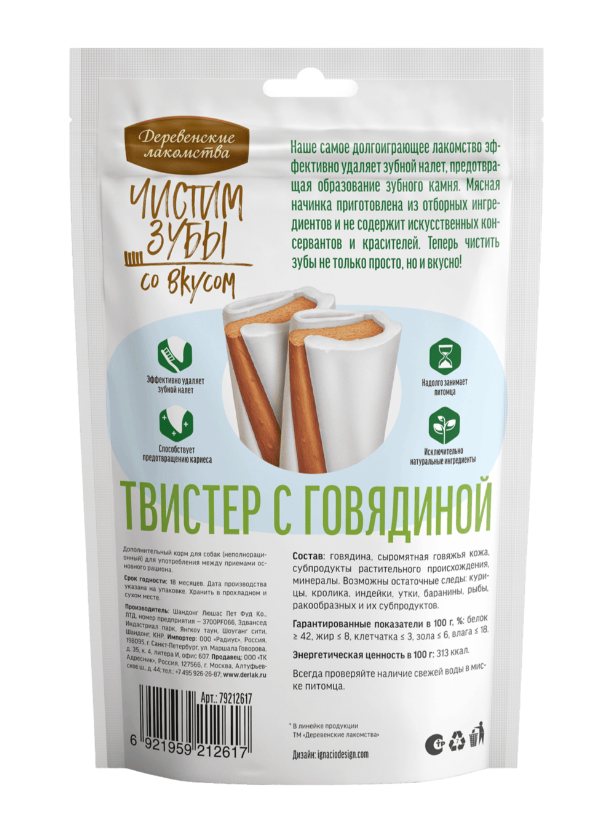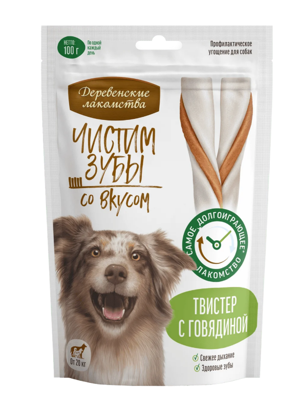 Твистер с говядиной для собак крупных пород — наше самое долгоиграющее лакомство. Эффективно удаляет зубной налет, предотвращая образование зубного камня. Мясная начинка приготовлена из отборных ингредиентов и не содержит искусственных консервантов и красителей.
