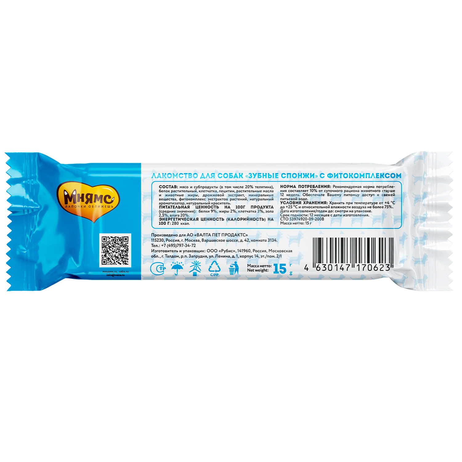 Мнямс DENTAL "Зубные спонжи"– вкусное и полезное лакомство для взрослых собак и щенков старше 3-х месяцев. Благодаря специальной форме и структуре, спонжи позволяют эффективно и бережно очистить и отполировать зубную эмаль без применения зубной пасты, предотвращают появление зубного налета и камня, защищают от появления запаха из пасти и снижают риск развития заболеваний полости рта.