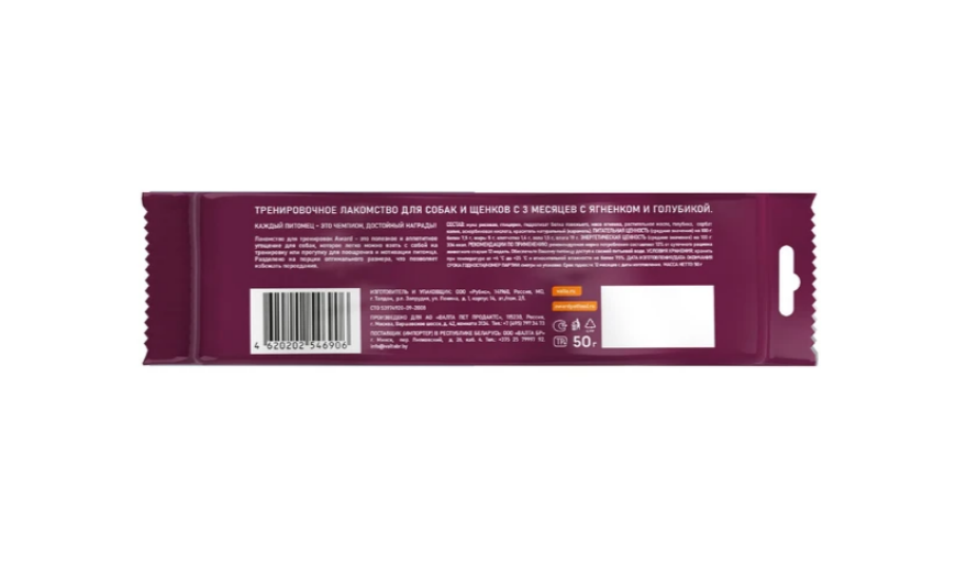 Состав: мука рисовая, глицерин, гидролизат белка говяжьего, мясо ягненка, растительное масло, голубика, сорбат калия, аскорбиновая кислота, краситель натуральный (карамель).