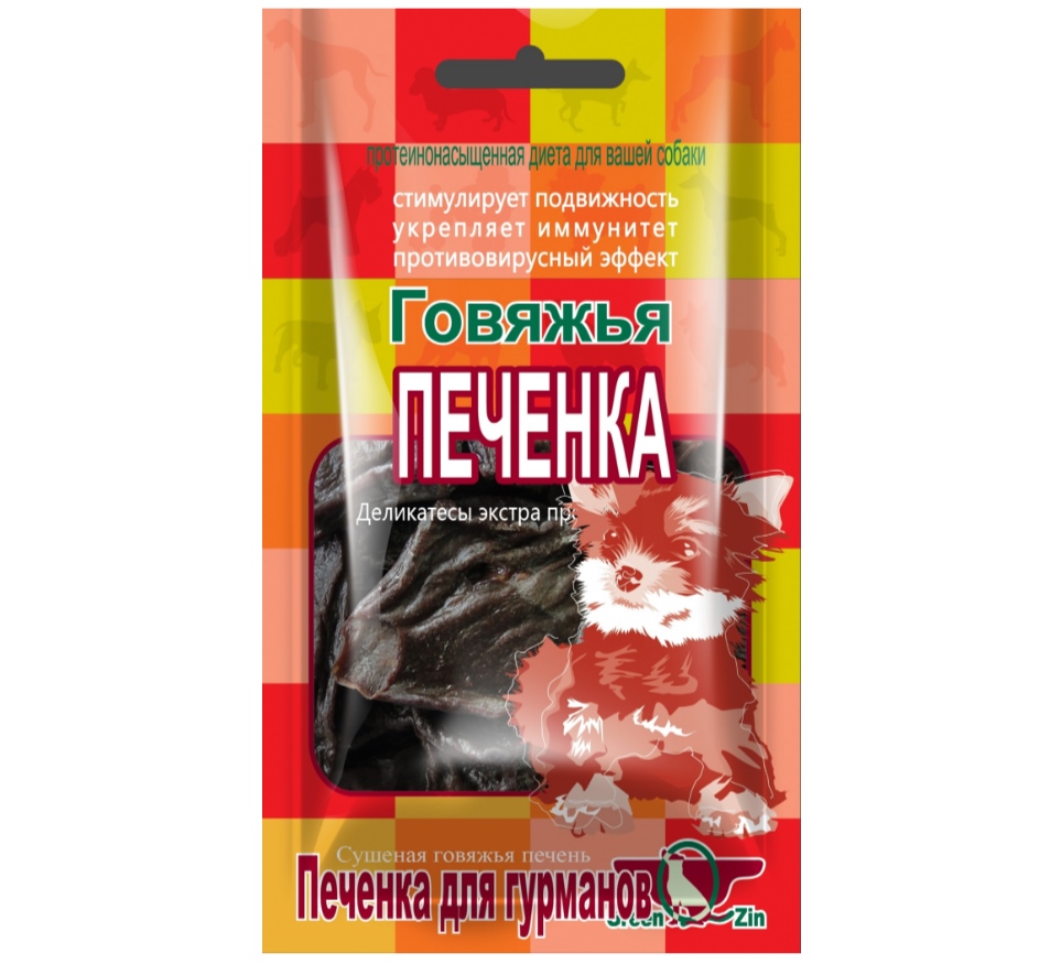 Кусочки вяленой говяжьей печени GREEN QZIN ГОВЯЖЬЯ ПЕЧЕНКА разработаны специально для собак всех пород для удовлетворения потребности в витаминах и минералах.Введение лакомства «ГОВЯЖЬЯ ПЕЧЕНКА» в дневной рацион позволит Вашей собаке поддерживать отличную форму и прекрасное самочувствие.Говяжья печень является активатором иммунитета животного, обладая сильным противовирусным эффектом.Деликатесное лакомство быстро и легко усваивается организмом и содержит целый ряд полезных веществ:В говяжьей печени содержится много витамина С и А, Е и К, Д и группы В и всего 100 граммов вяленной печени компенсирует суточную потребность даже крупной собаки в витаминах.Высокое количество минералов: зде