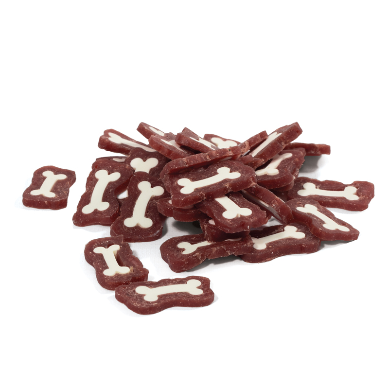 Состав: мясо утки - 46%, рисовая мука - 15.9%, кукурузный крахмал - 14.8%, пшеничная мука - 10.6%, глицерин - 6.38%, арахисовый белок - 3%, сорбитол - 2.95%, соль - 0.2%, сорбат калия - 0.1%, ароматизатор сыра - 0.07%.
