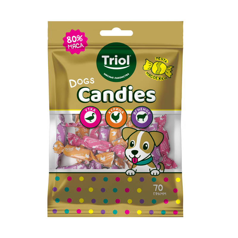 Мясные конфеты для собак Triol на 100% состоят из счастья вашей собаки. Мы считаем, что о вкусах не спорят, и поэтому внутри упаковки собрали 18 конфет со вкусами утки, курицы и ягненка. Полезное угощение подойдет для ежедневного применения. Небольшая форма будет удобна для использования на тренировках и дома для простого собачьего баловства. Наши мясные конфеты очень удобно держать под рукой (или в кармане, где хранятся запасы вкусняшек любого собачника). Фантик надежно защищает карман владельца от запаха и не пачкает одежду. Настоящая мечта мясоежки! Цвет: коричневый.