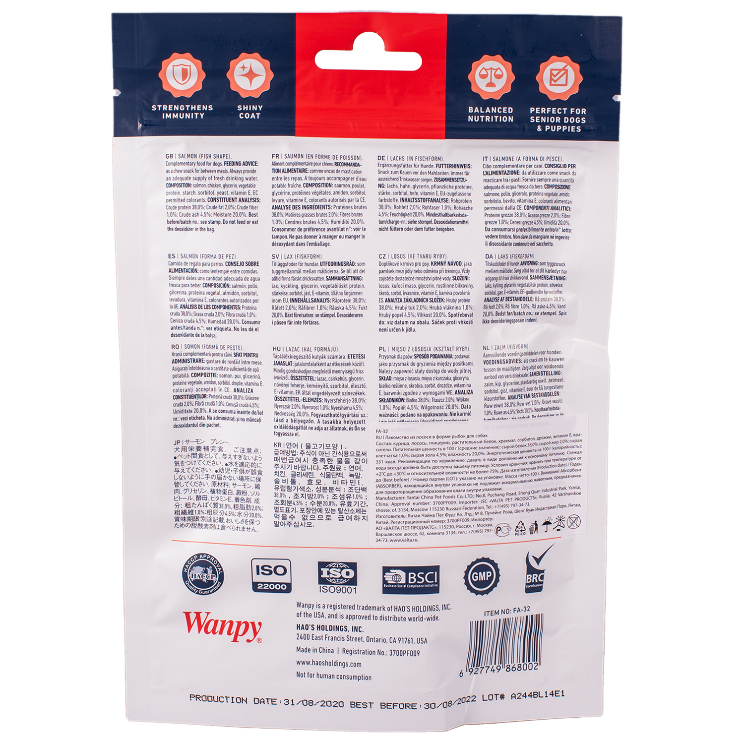 Состав: лосось, курица, глицерин, растительный протеин, крахмал, сорбитол, дрожжи, витамин Е, разрешенные ЕС красители.