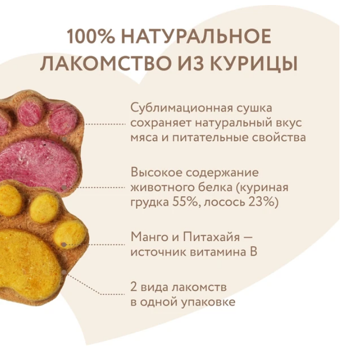 "Мнямс" Лакомство "Фросты" с лососем для собак и щенков с 4 месяцев - это сублимированные беззерновые лакомства с высоким содержанием животного белка (куриная грудка 55%, лосось 23%), созданные при помощи прогрессивной технологии сушки, которая сохраняет натуральный вкус мяса и питательные свойства ингредиентов. Манго и питахайя в составе являются источниками витаминов группы В, необходимых для укрепления иммунитета питомца.