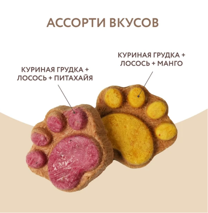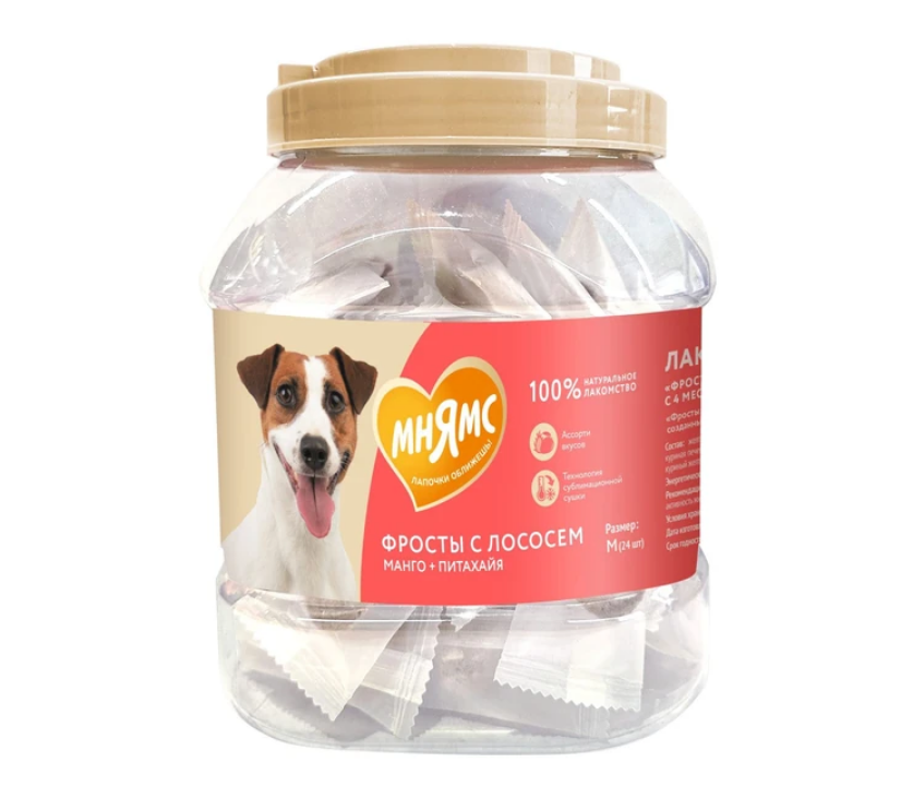 Одна упаковка "Фростов" содержит лакомства двух видов: с лососем и манго и с лососем и питахайей, которые подходят для питомцев всех пород.
