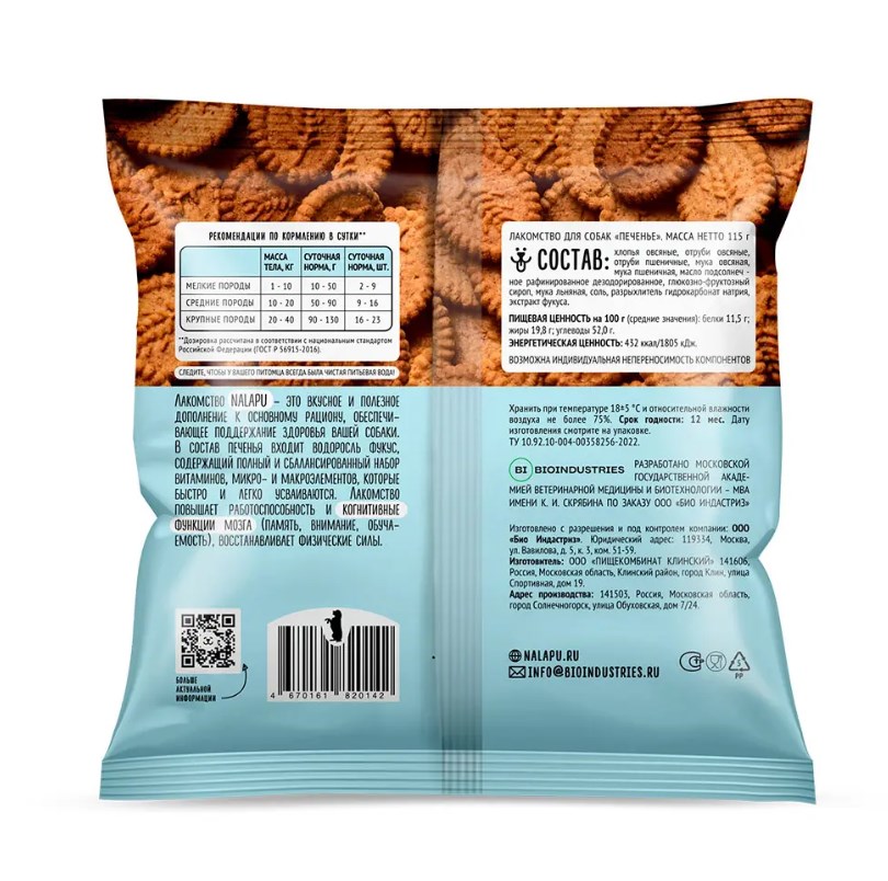 Лакомство NALAPU – это вкусное и полезное дополнение к основному рациону, обеспечивающее поддержание здоровья вашей собаке. В состав печенья входит входит водоросль фукус, содержащий полный и сбалансированный набор витаминов, микро- и макроэлементов, которые быстро и легко усваиваются. Лакомство повышает работоспособность и конгитивные функции мозга (память, внимание, обучаемость), восстанавливает физические силы.