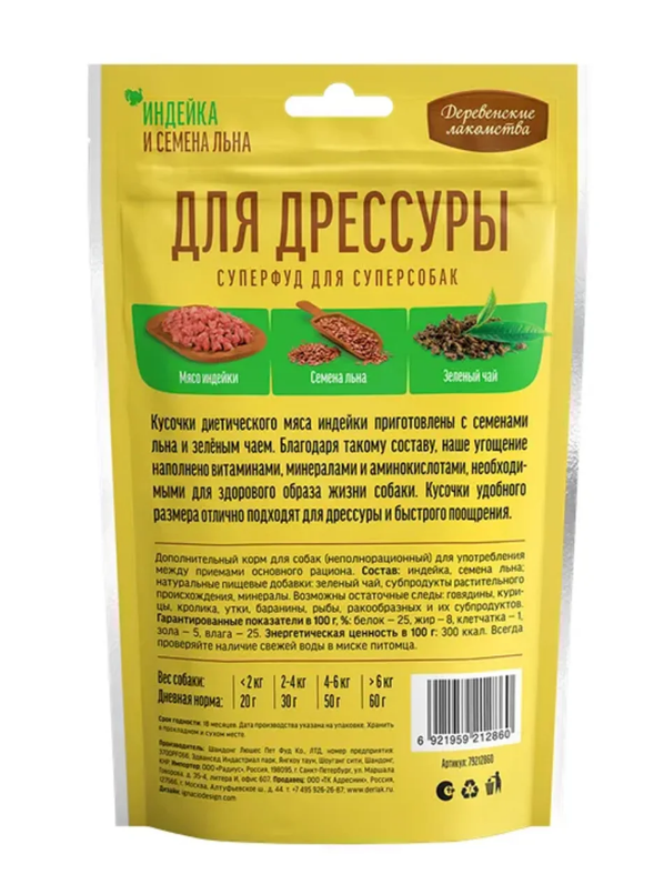 "Деревенские лакомства" отбираются и обрабатываются вручную и могут служить эталоном лакомств для домашних животных. Наше новое лакомство создано специально для дрессуры собак. В отборное мясо индейки мы добавили полезные семена льна. Сочетание диетического мяса и большого количества витаминов, аминокислот и антиоксидантов делают это лакомство идеальным для тренировок.