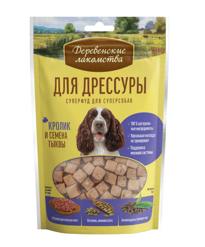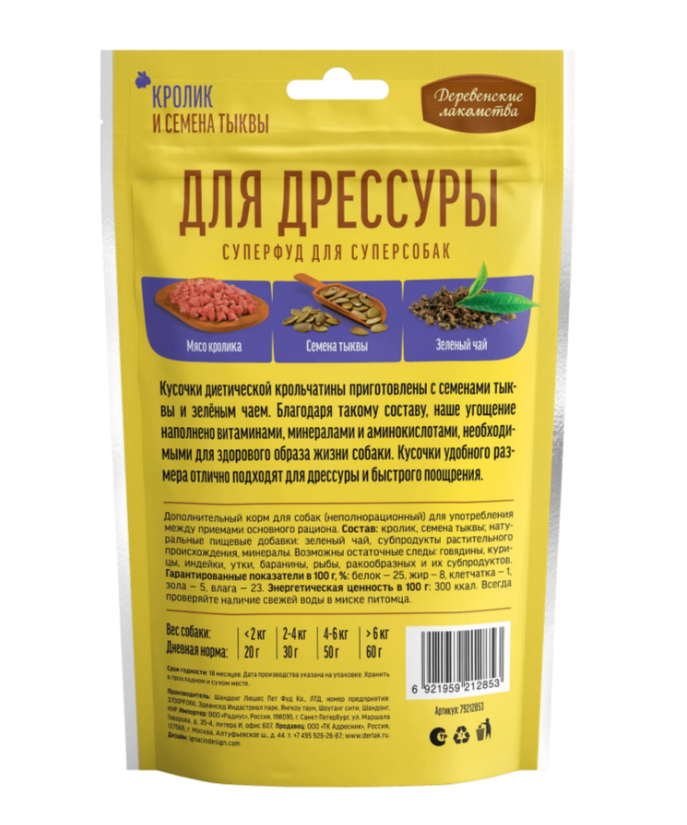 Натуральное мясное лакомство создано специально для дрессуры собак. Семена тыквы славятся высоким содержанием витаминов, аминокислот и минералов. В сочетании с диетическим мясом кролика это лакомство становится полезным и необычайно вкусным.