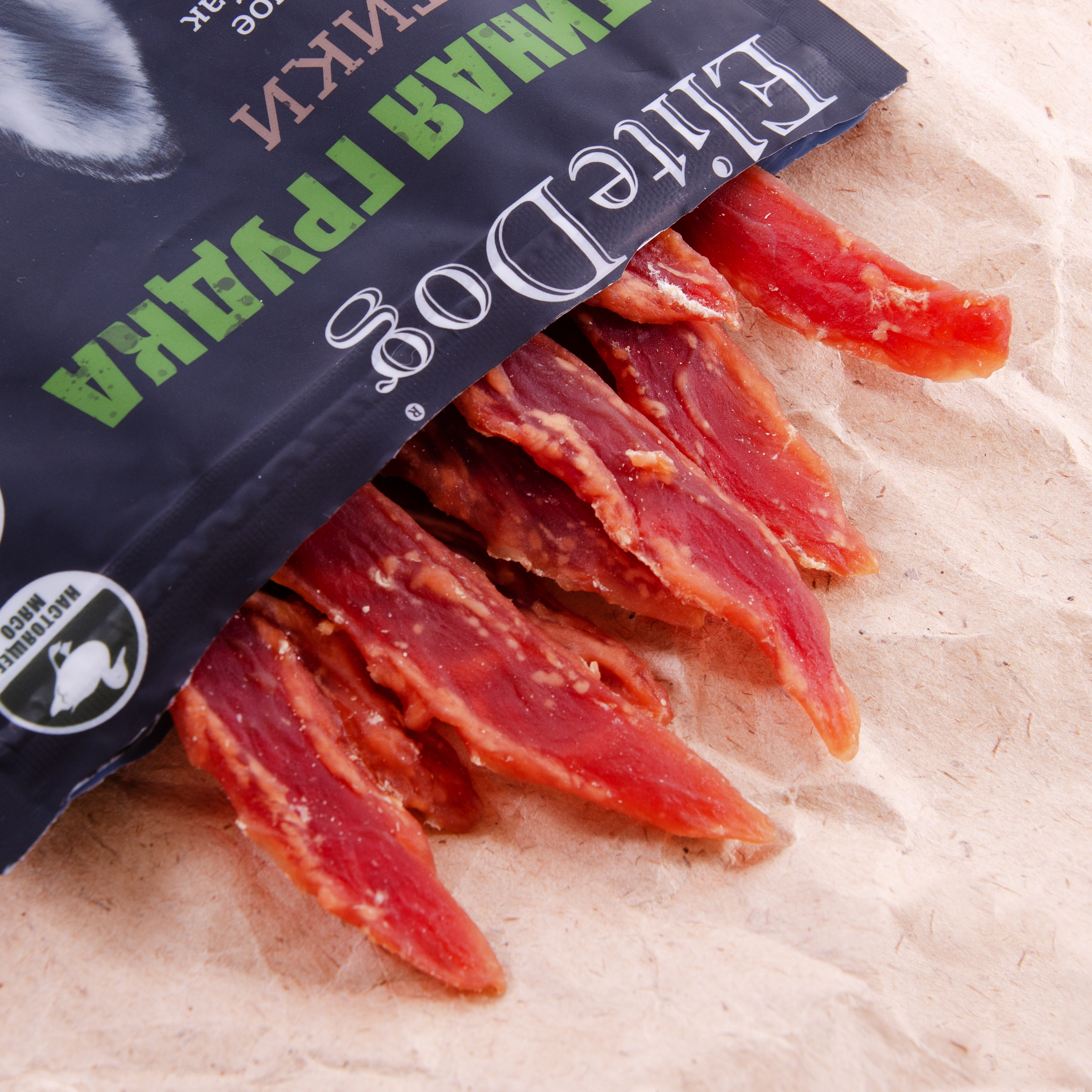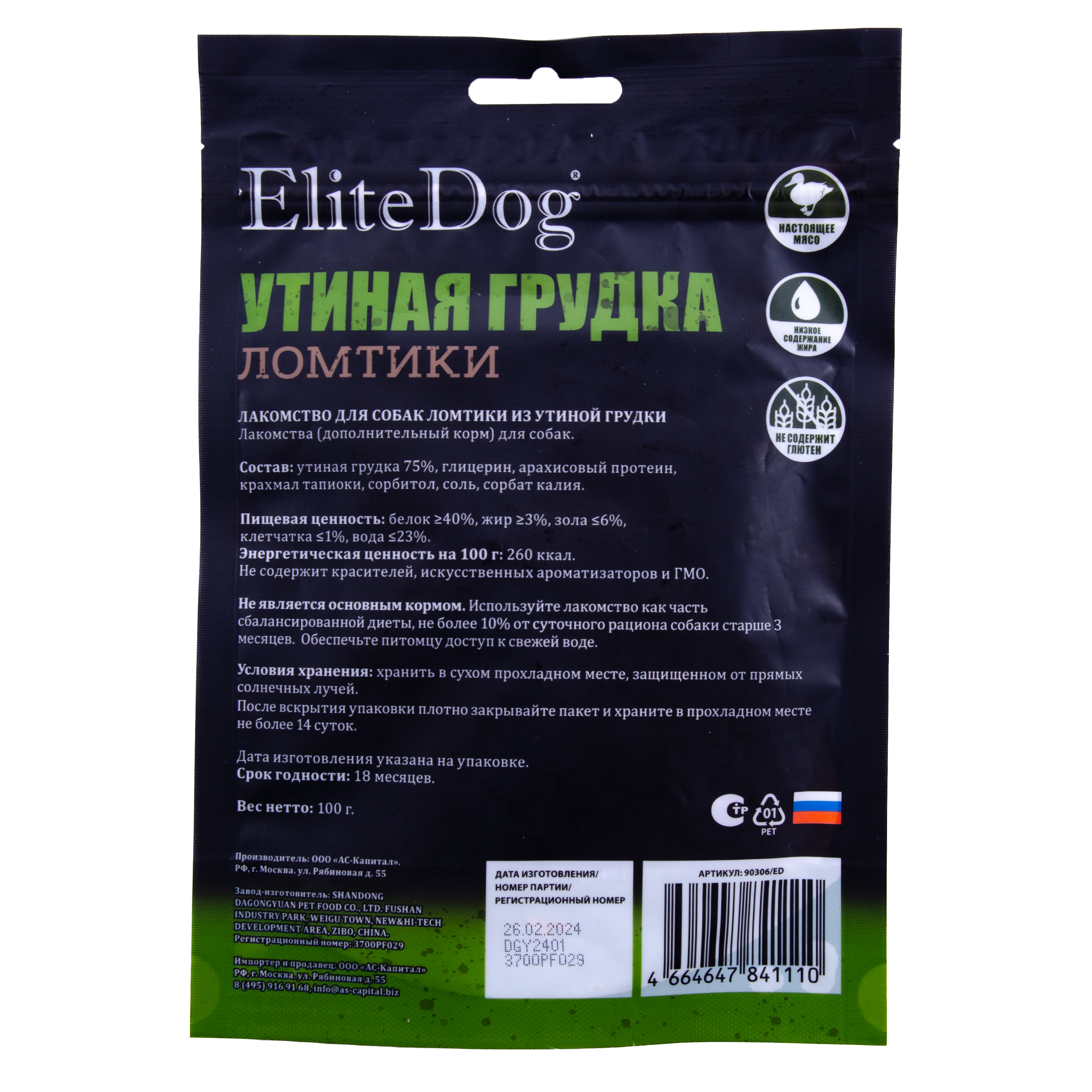 Состав: Утиная грудка 75%, глицерин 8%, порошок арахисового белка 7%, крахмал тапиоки 6%, сорбит 3,8%, соль 0,1%, сорбат калия 0,1%.