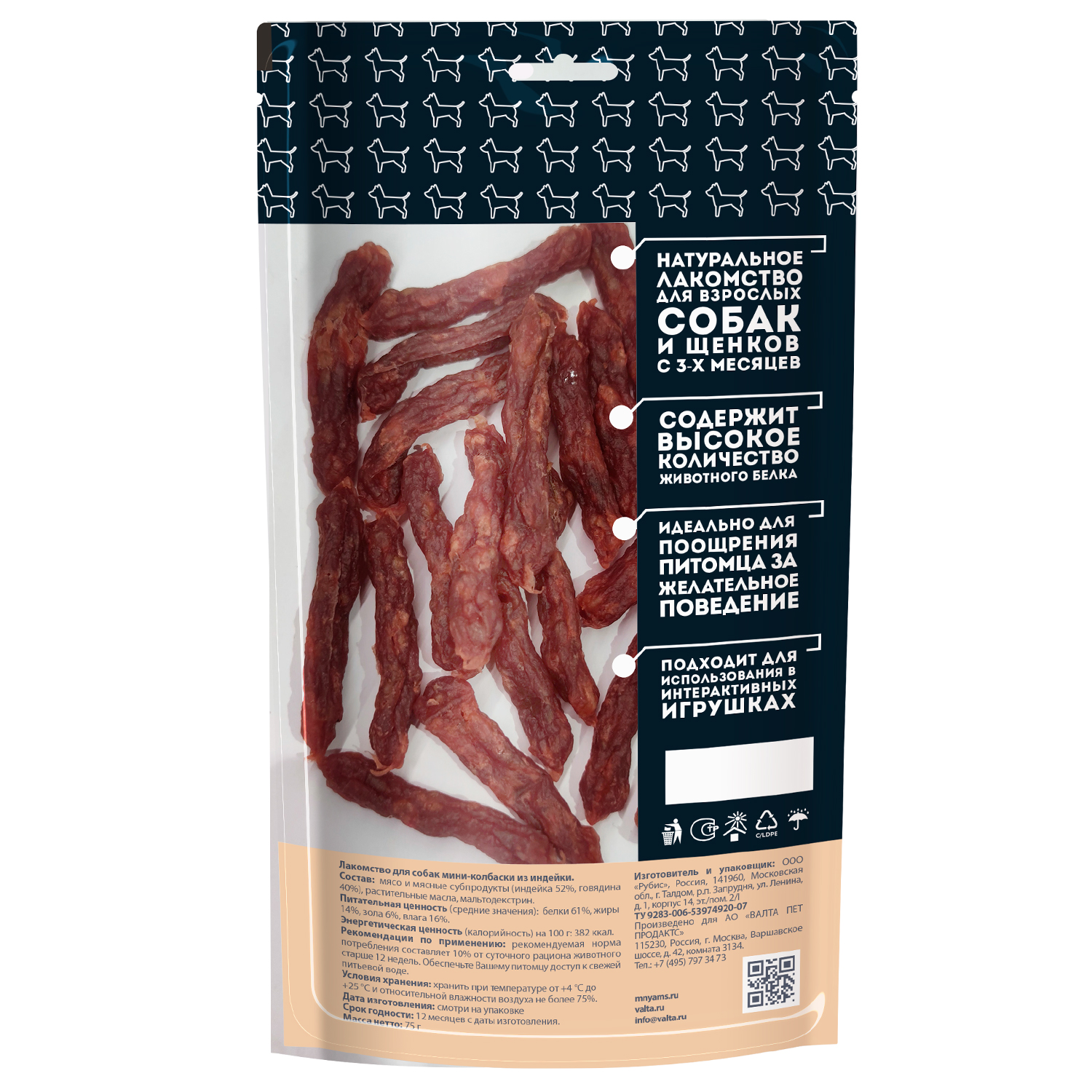 Мини-колбаски из индейки - вкусное и полезное лакомство для собак мелких и средних пород, а также щенков старше 3-х месяцев с высоким содержанием белка, незаменимыми аминокислотами, витаминами и минералами.