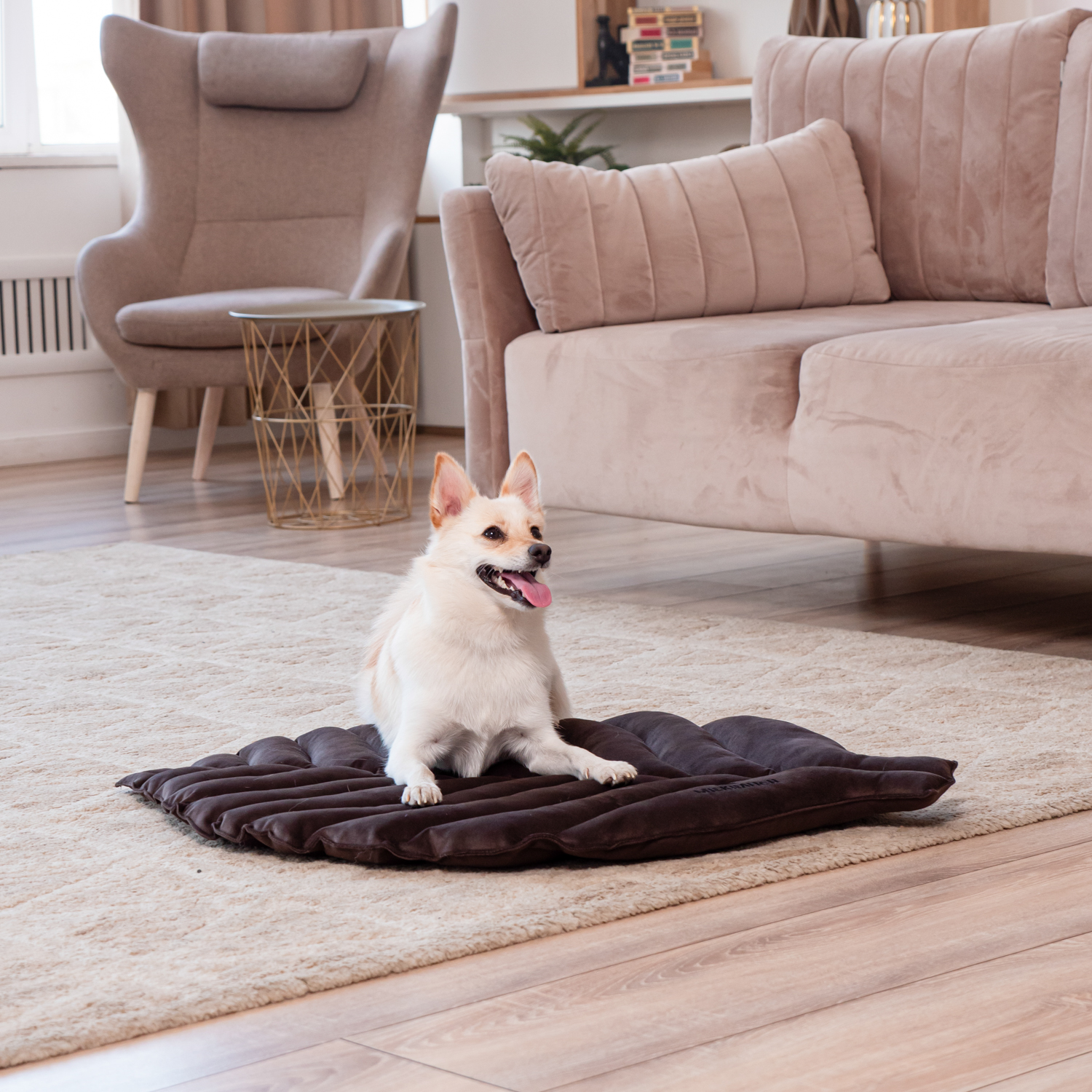 ✅ Лежанка выполнена из прочного мебельного велюра и отличается высокой степенью резистентности к появлению царапин и зацепок.