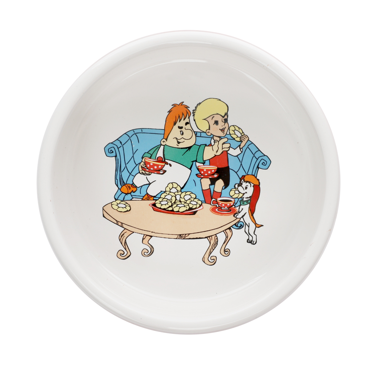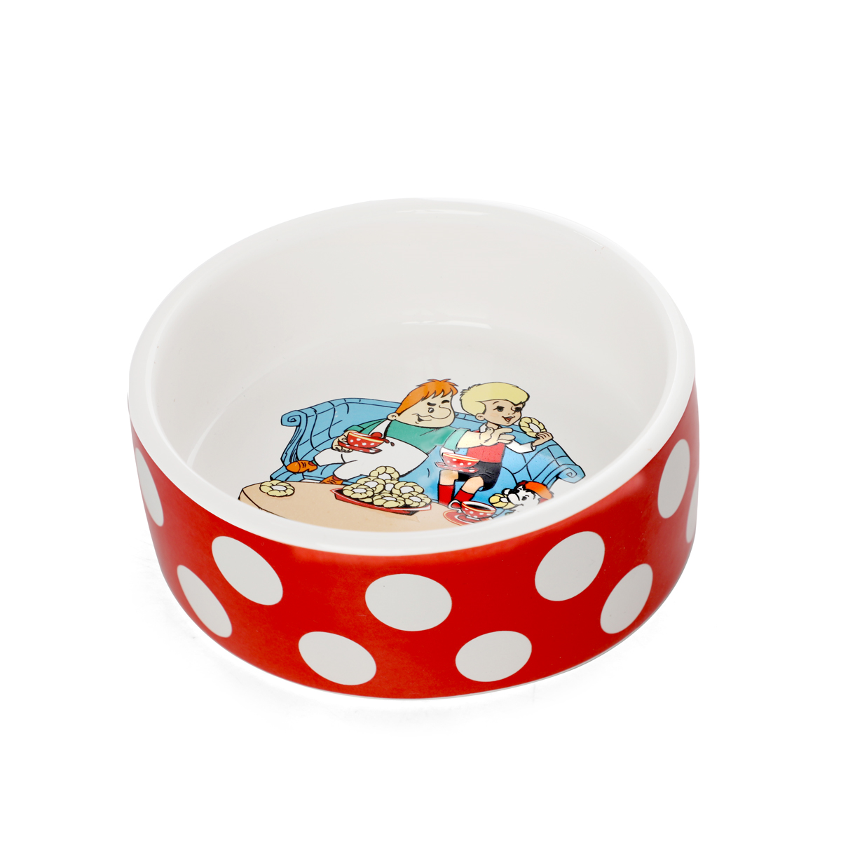 Стильная керамическая миска с ярким красно-белым дизайном, украшенная персонажами известного мультфильма.