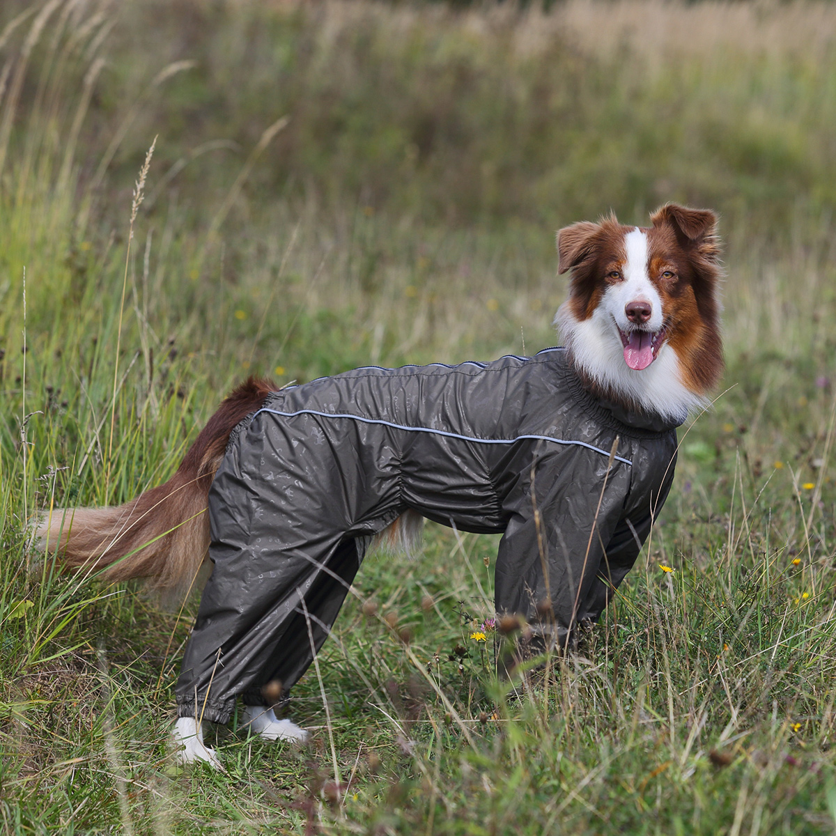 Предназначен для прогулок в межсезонье, в сырую погоду для защиты собаки от грязи и воды.