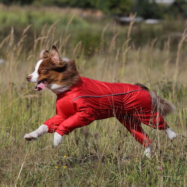 Комбинезон для собак эргономичен, удобен, не сковывает движений собаки при беге, во время игры и при дрессировке. Комфортная посадка по корпусу достигается за счет резинок-утяжек под грудью и животом. От попадания воды и грязи внутрь комбинезона низ штанин также сборен на резинку.