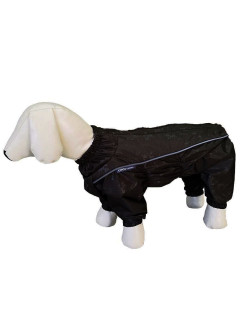 Комбинезон для собак без подкладки из водоотталкивающей и ветрозащитной ткани (100% полиэстер). Предназначен для прогулок в межсезонье, в сырую погоду для защиты собаки от грязи и воды. Комбинезон выполнен из двух сочетаемых по цвету тканей, используется отделка со светоотражающим кантом и тракторная молния со светоотражающей полосой. Комбинезон для собак эргономичен, удобен, не сковывает движений собаки при беге, во время игры и при дрессировке. Комфортная посадка по корпусу достигается за счет резинок-утяжек под грудью и животом. На воротнике имеется кнопка для фиксации. От попадания воды и грязи внутрь комбинезона низ штанин также сборен на резинку. Рекомендуется машинная стирка с использованием средства для стирки деликатных тканей при температуре не выше 40?С и загрузке барабана не более чем на 40% от его объема, отжим при скорости не более 400/500 об/мин, сушка на воздухе - с целью уменьшения воздействия на водоотталкивающую (PU) пропитку ткани.