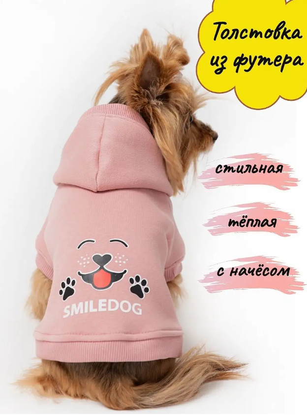 Яркую толстовку с капюшоном одевают собачкам. Перед выбором размера посмотрите размерную таблицу во втором фото. Длину спины измеряйте от холки где сходятся лопатки до начала хвоста. Мягкий товар сшит для животных от ветра и пыли на прохладную погоду. Утепленная толстовка с начесом изготовлена из футера 3-х нитки ткани с натуральным хлопковым ворсом. Однотонная толстовка с коротким рукавом подойдет сфинксам. Теплая толстовка пушистая внутри согреет и защитит от холодов. Стильная толстовка с рисунком порадует владельцев и их четвероногих друзей. Модная кофта как первая вещь для щенков и котят. Спортивная одежда с капюшоном легко одевается и не сковывает движения любимцев. Комфортный наряд для мелких и средних собак и котов. Свободный свитшот подойдет для весны, лета и осени. Зоотовар подходит для кошек лысых и с шерстью используют при линьке. Повседневная одежда создаст уют дома и на улице. Уход: рекомендуем ручную или машинную стирку при 40 С, выполаскивать моющее средство.