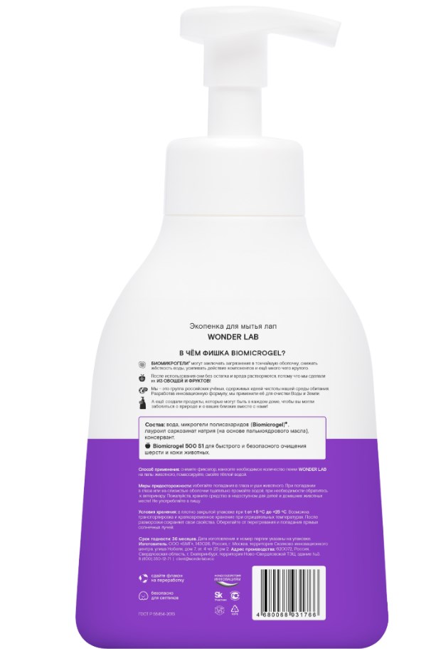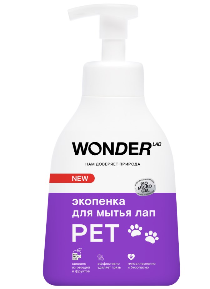 Экопена для мытья лап питомцев после прогулки от WONDER LAB незаменима для кошек, собак и остальных выгуливаемых питомцев, живущих в квартирах и домах. Грязь, пыль, реагенты и другие следы веселых прогулок легко смоются экопенкой. Пена не пахнет и не остается на шерсти, поэтому средство для мытья лап безопасно для животного при вылизывании. Экологичная пенка для лап гипоаллергенна, не сушит и не раздражает кожу домашних любимцев.