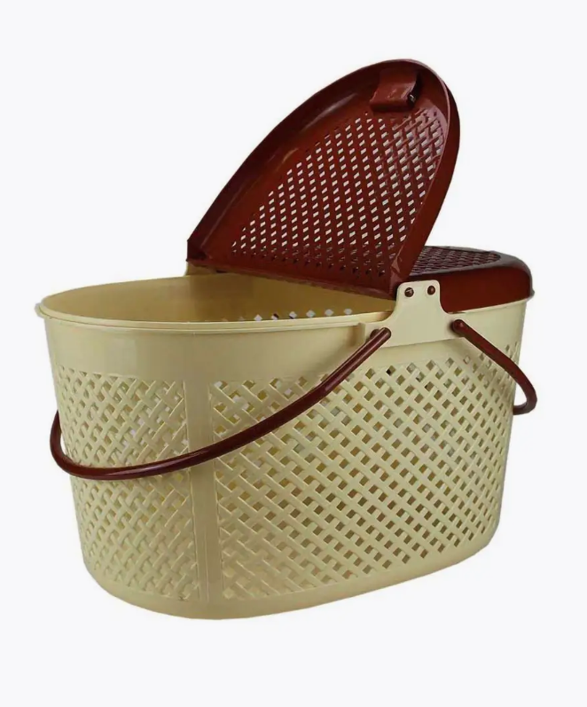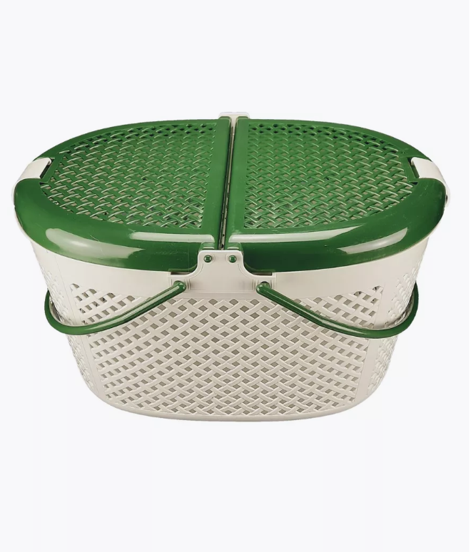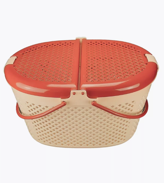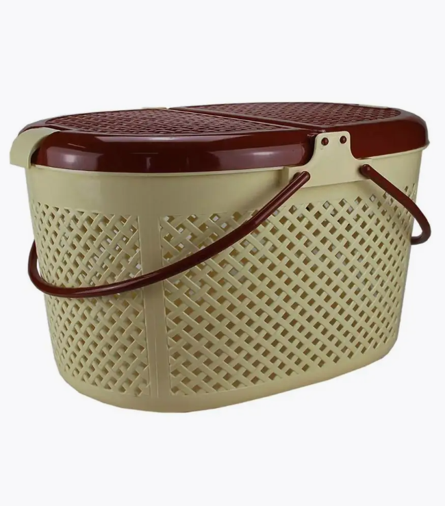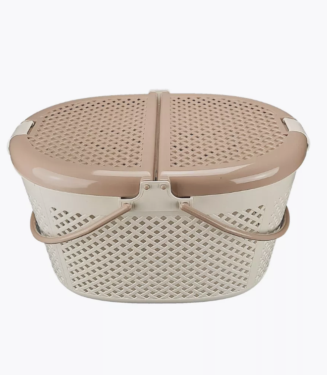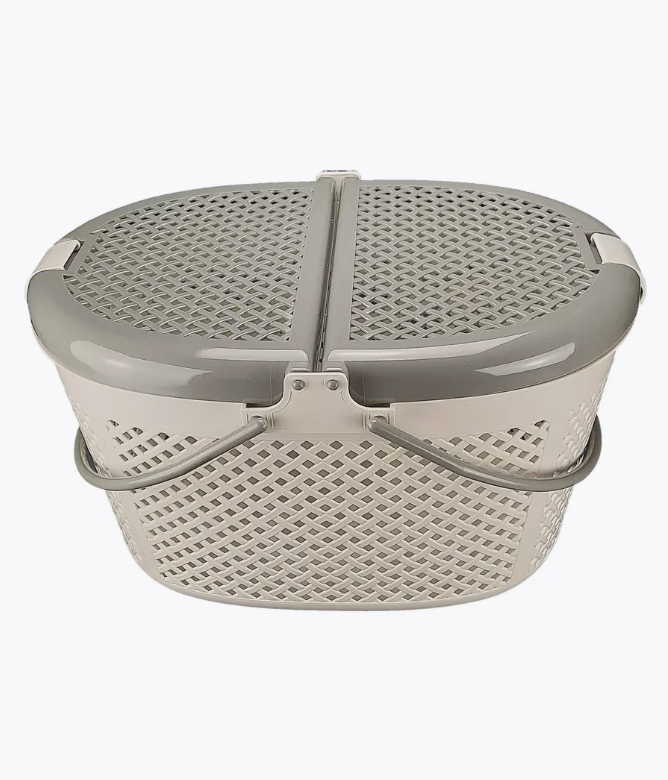 Корзинка изготовлена из плотного нетоксичного пластика в овальной форме. По всему корпусу переноски сделаны квадратные отверстия для вентиляции. Переноска открывается сверху. Крышка корзинки-переноски открывается в виде книги и имеет надежные защелки. Для удобства сделаны две круглые ручки.
