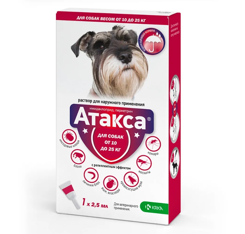 Атакса - комбинированный инсектицидный препарат, эффективное средство против имагинальных, преимагинальных и личиночных фаз развития вшей, блох, власоедов, паразитирующих на собаках. Имидаклоприд и перметрин, входящие в состав препарата, обладая синергидным эффектом, оказывают выраженное инсектицидное действие на насекомых.