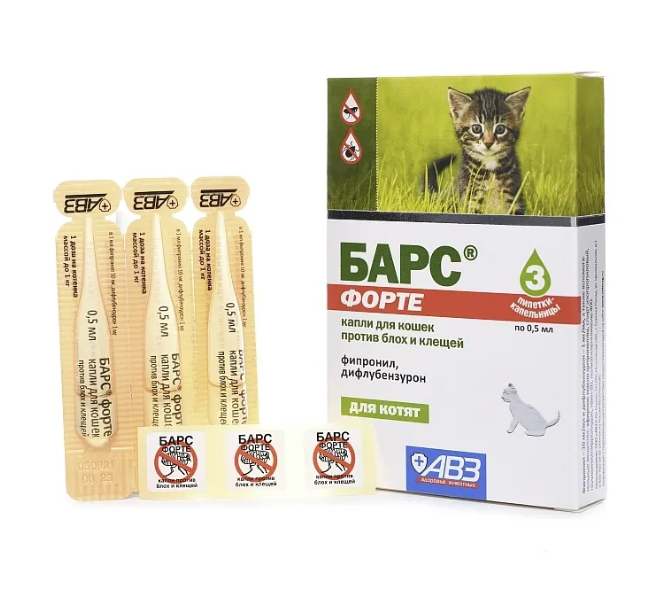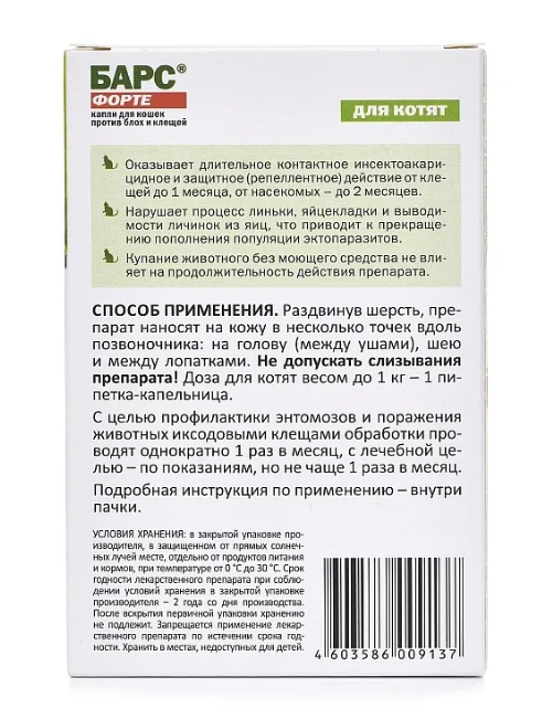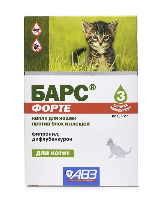 БАРС® форте капли для кошек против блох и клещей назначают котятам с 8-недельного возраста с лечебной и профилактической целью при энтомозах, вызванных вшами, блохами, власоедами, и нотоэдрозе (чесотка), поражают иксодовыми клещами, а также для предотвращения нападения эктопаразитов на животных.