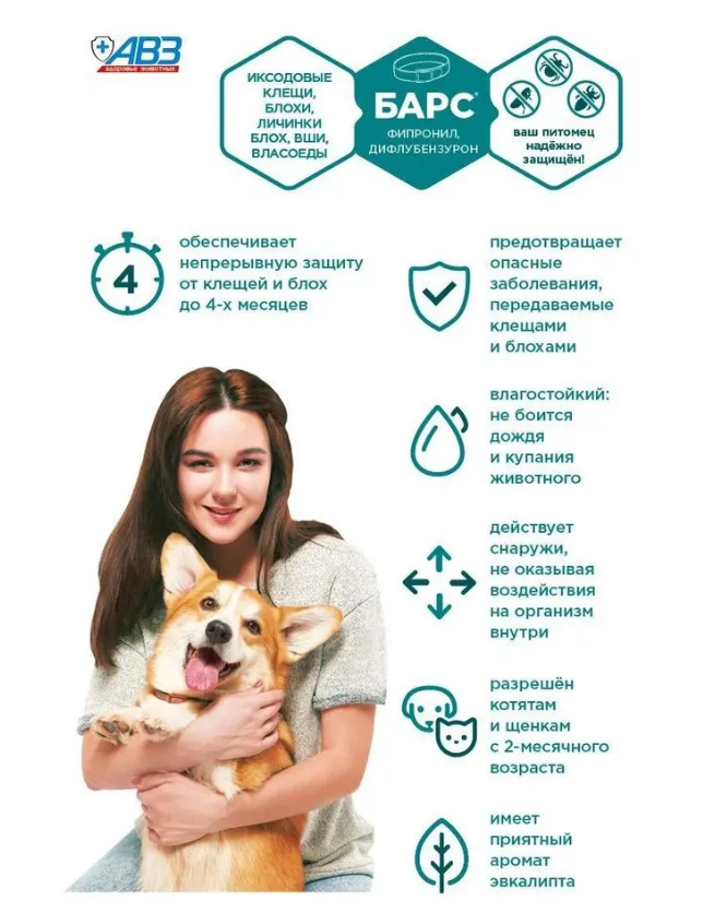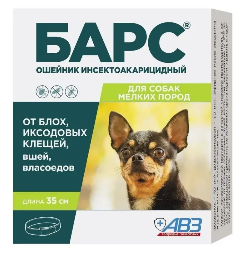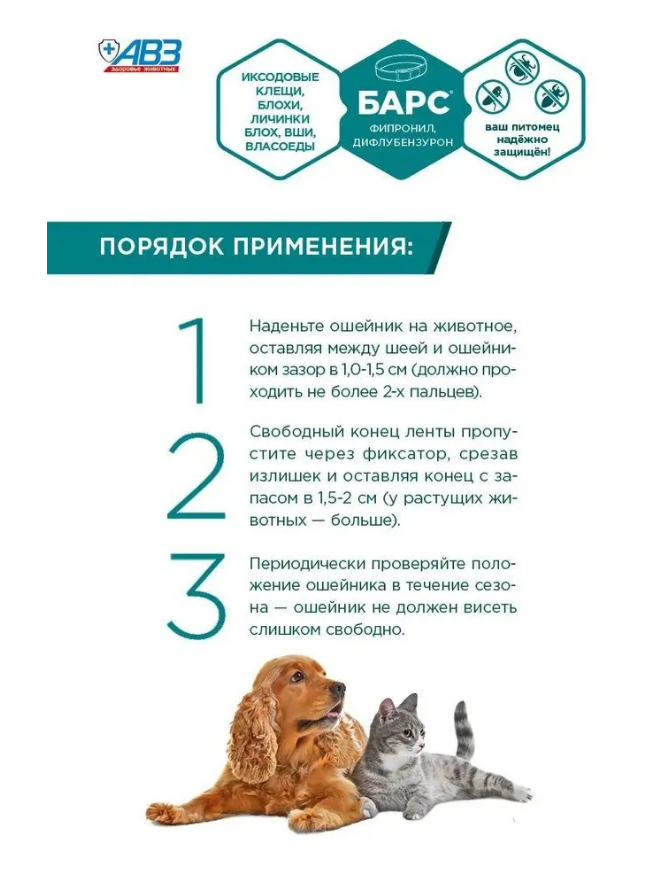 БАРС® ошейник инсектоакарицидный обеспечивает широкий спектр инсектоакарицидного действия на половозрелые и неполовозрелые (личинки) фазы развития блох, вшей, власоедов и иксодовых клещей, паразитирующих на собаках.