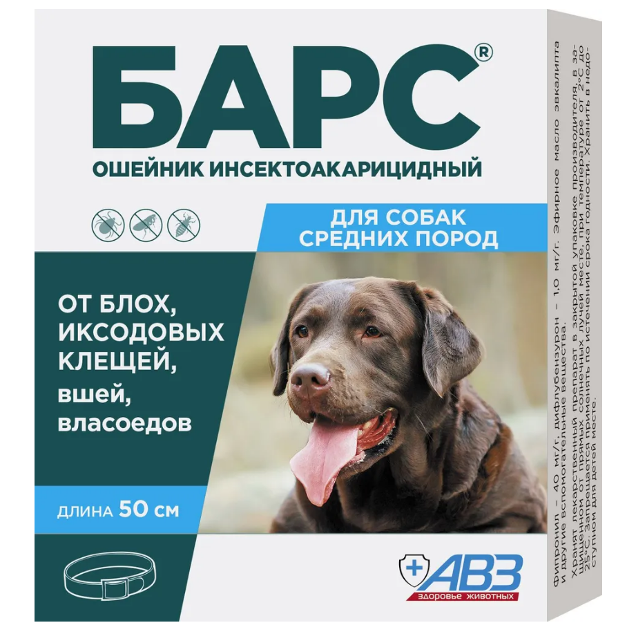 БАРС® ошейник инсектоакарицидный обеспечивает широкий спектр инсектоакарицидного действия на половозрелые и неполовозрелые (личинки) фазы развития блох, вшей, власоедов и иксодовых клещей, паразитирующих на собаках.