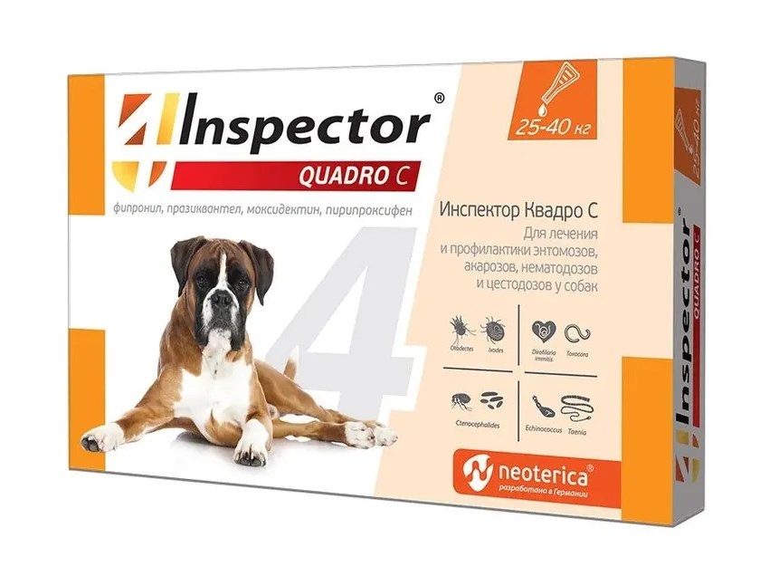 Наши cобаки находятся под постоянной угрозой заражения паразитами: клещами, блохами, власоедами и гельминтами. Inspector защищает от 20 видов внешних и внутренних паразитов. Inspector — это инсектоакарицид и антигельминтик.