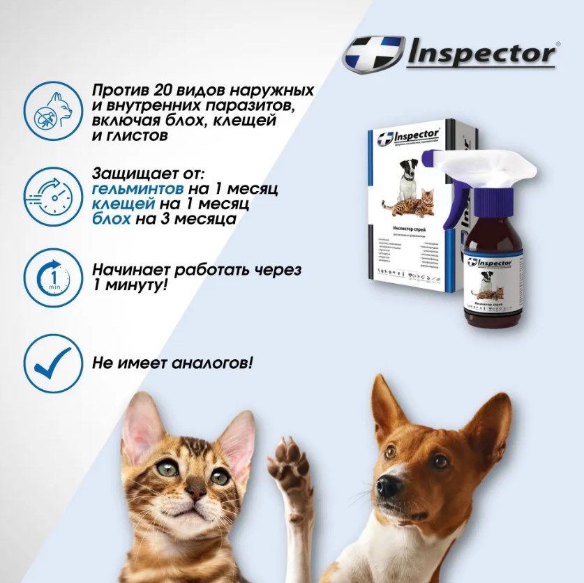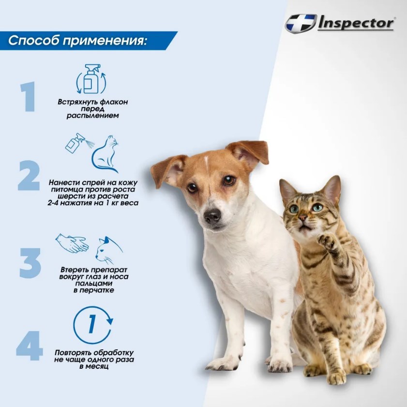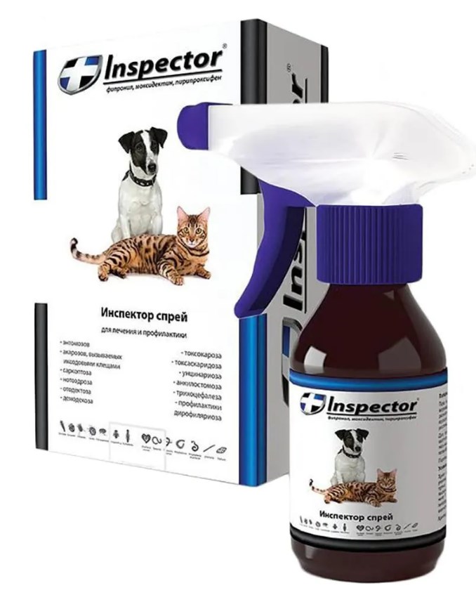 Инспектор спрей применяют собакам и щенкам, кошкам и котятам старше 7-недельного возраста для лечения и профилактики энтомозов (блохи, вши, власоеды), акарозов (вызываемых иксодовыми клещами, демодекоза, отодектоза, саркоптоза, нотоэдроза), кишечных нематодозов (токсокароза, токсаскаридоза, унцинариоза, анкилостомоза, трихоцефалеза), а также в целях профилактики дирофиляриоза. Противопоказанием к применению спрея Инспектор является индивидуальная повышенная чувствительность животного к компонентам препарата. Не подлежат обработке больные инфекционными болезнями и ослабленные собаки, кошки и животные других видов. Не допускается аурикулярное применение препарата (при ушной чесотке) при прободении барабанной перепонки. Обработку собак и кошек массой менее 1 кг следует проводить с осторожностью под наблюдением ветеринарного врача.
