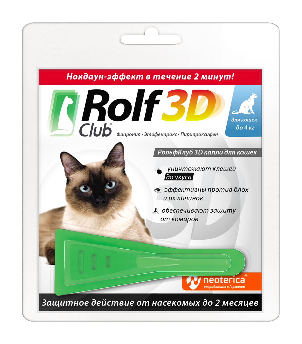 RolfClub 3D капли для кошек применяют кошкам и котятам старше 12-недельного возраста при энтомозах (блохи, вши, власоеды), отодектозе, саркоптозе, поражении иксодовыми клещами, для защиты животных от нападения летающих кровососущих насекомых.