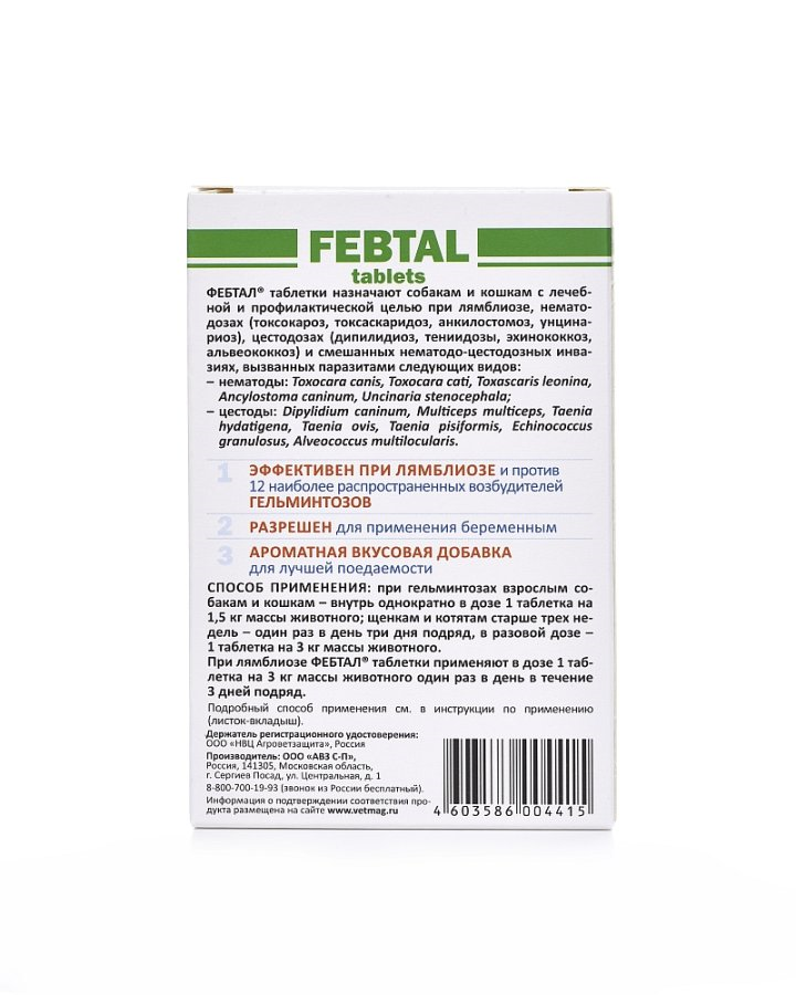 • щенкам и котятам (в возрасте старше трех недель) Фебтал применяют один раз в день три дня подряд, в разовой дозе – 1 таблетка на 3 кг массы животного.