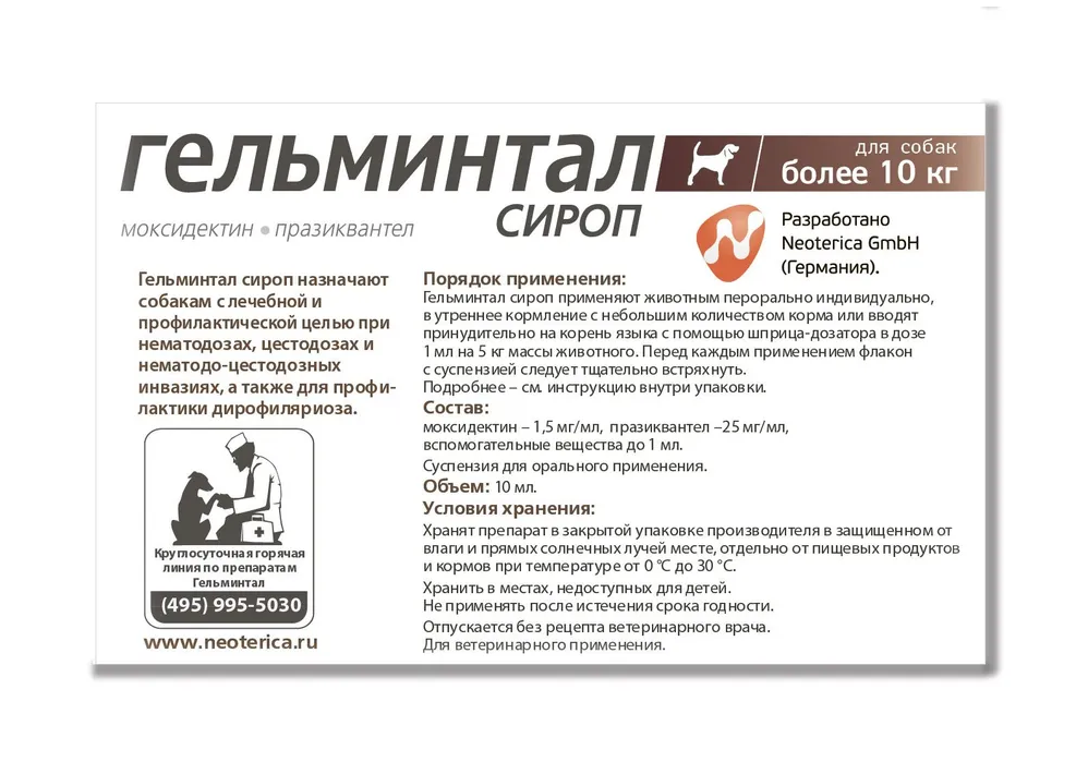 Сироп Гельминтал на 50% состоит из сливочного кондитерского сиропа. Ваша собака может съесть его сама вместе с едой или дайте сироп через шприц-дозатор, входящий в комплект.