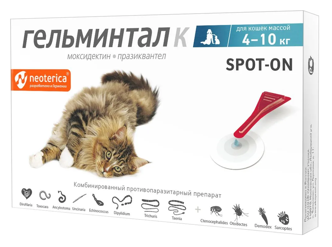Капли от гельментов Гельминтал Spot-on — новая ветеринарная разработка, которая уже зарекомендовала себя на рынке и хорошо показала на практике. Миллионы владельцев кошек и котов разных пород выбирают Neoterica — он помогает избавиться от паразитов и глистов в организме животного, чтобы ваш любимец был здоров и жил полноценной жизнью.