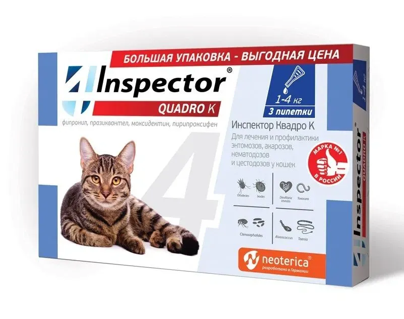 Инспектор Квадро К относится к фармакотерапевтической группе "противопаразитарные средства в комбинациях".