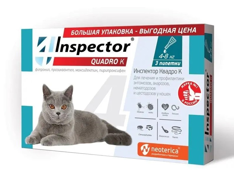 Инспектор Квадро К относится к фармакотерапевтической группе "противопаразитарные средства в комбинациях".