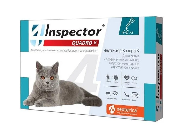 Инспектор Квадро К относится к фармакотерапевтической группе "противопаразитарные средства в комбинациях".