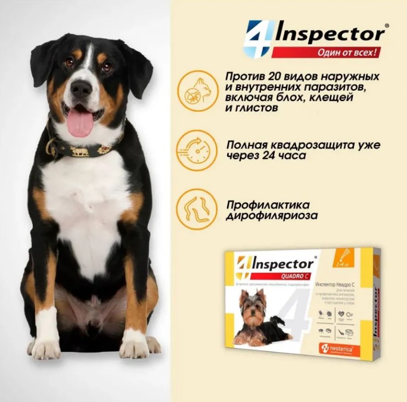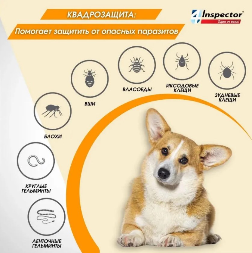Наши cобаки находятся под постоянной угрозой заражения паразитами: клещами, блохами, власоедами и гельминтами. Inspector защищает от 20 видов внешних и внутренних паразитов. Inspector — это инсектоакарицид и антигельминтик.