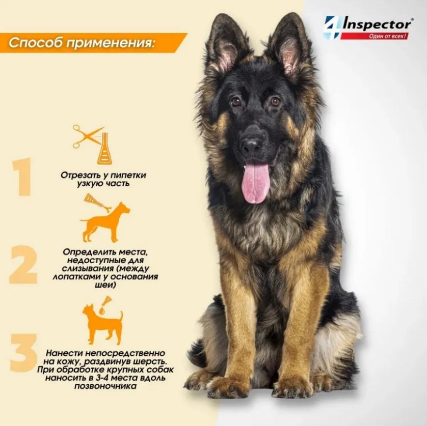 Нанесите Inspector на кожу в области холки (между лопатками), максимально раздвигая шерсть. Не втирайте. Не рекомендовано мыть животное 2 дня до и 4 дня после обработки. Подробнее: см. инструкцию по применению препарата.