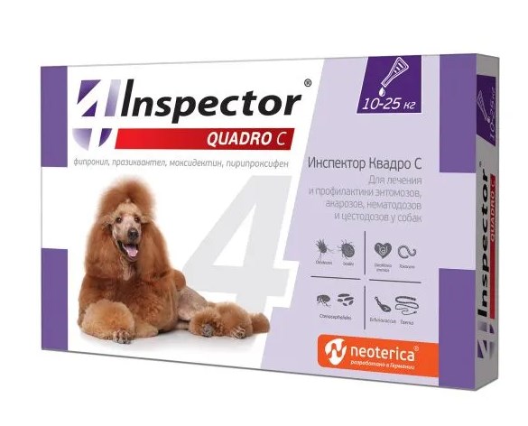 Наши cобаки находятся под постоянной угрозой заражения паразитами: клещами, блохами, власоедами и гельминтами. Inspector защищает от 20 видов внешних и внутренних паразитов. Inspector — это инсектоакарицид и антигельминтик.
