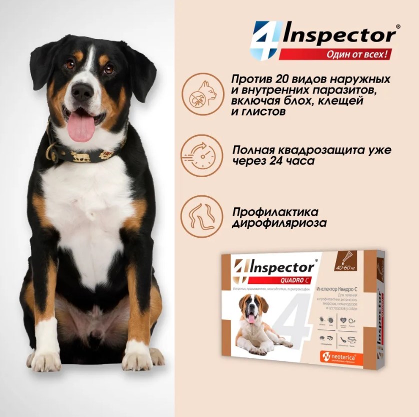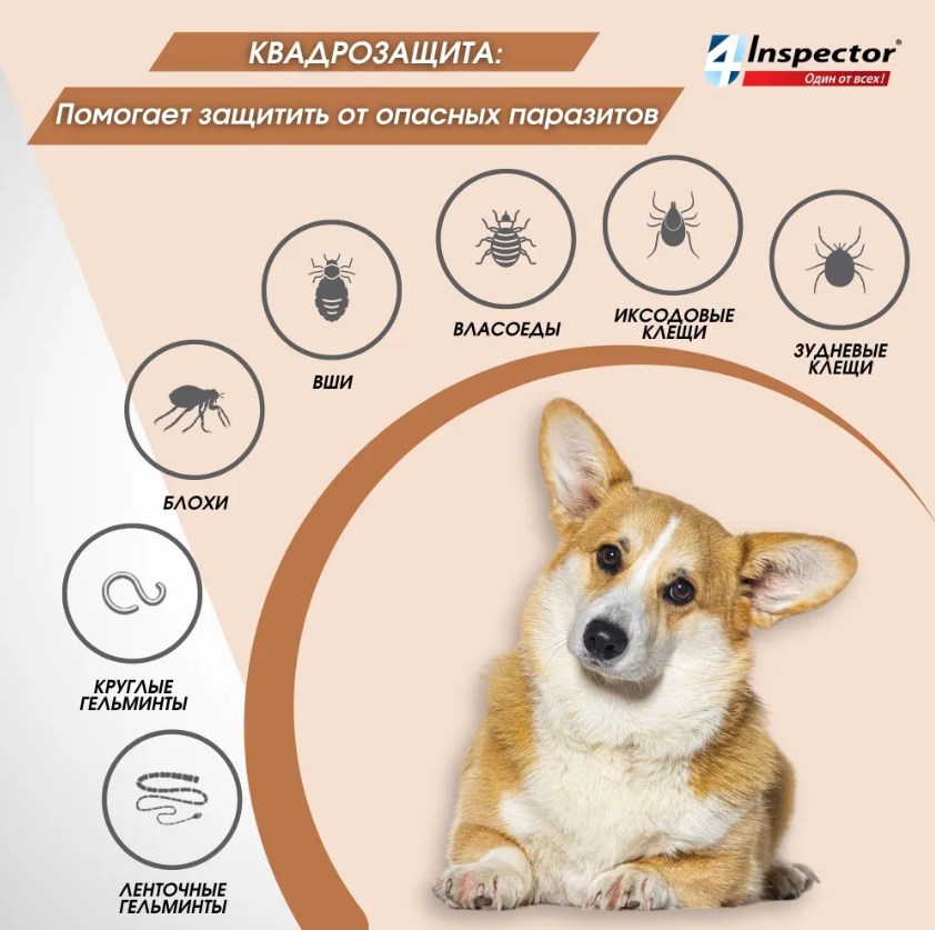 Наши cобаки находятся под постоянной угрозой заражения паразитами: клещами, блохами, власоедами и гельминтами. Inspector защищает от 20 видов внешних и внутренних паразитов. Inspector — это инсектоакарицид и антигельминтик.
