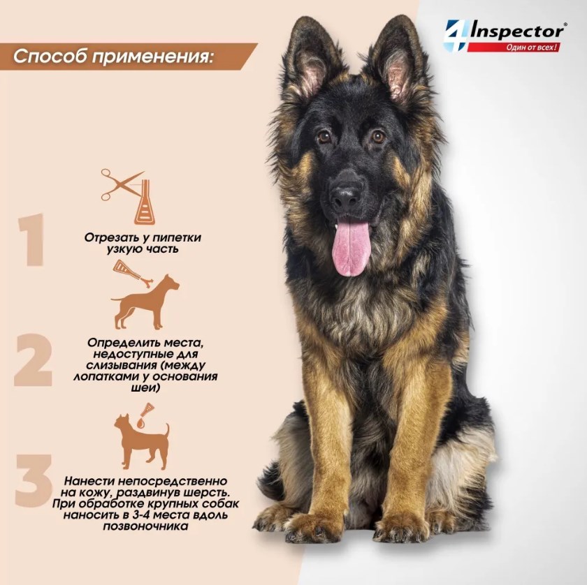 Нанесите Inspector на кожу в области холки (между лопатками), максимально раздвигая шерсть. Не втирайте. Не рекомендовано мыть животное 2 дня до и 4 дня после обработки. Подробнее: см. инструкцию по применению препарата.